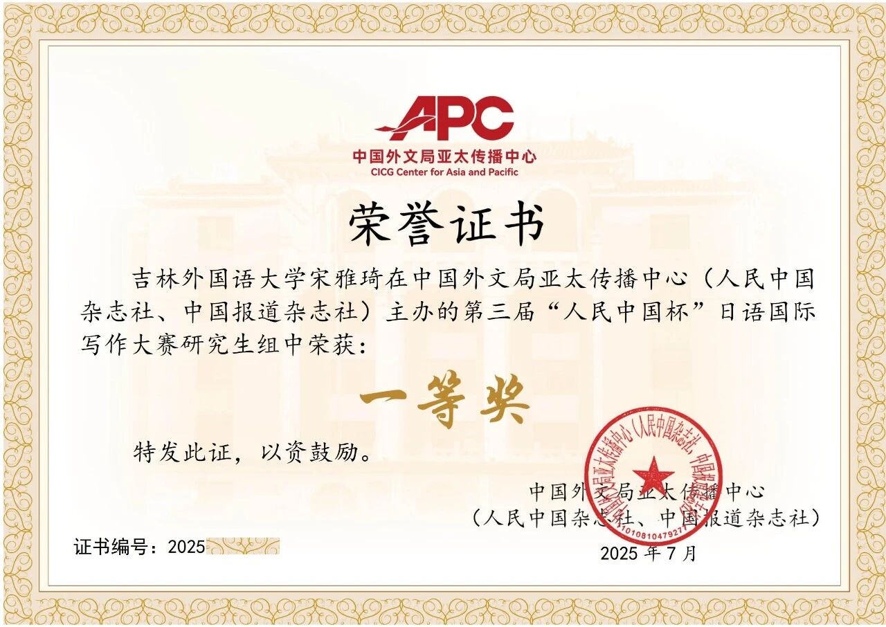 近日,第三届“人民中国杯”日语国际写作大赛结果揭晓,高级翻译学院王超伟老师指导的24级日语笔译研究生宋雅琦荣获研究生组一等奖。