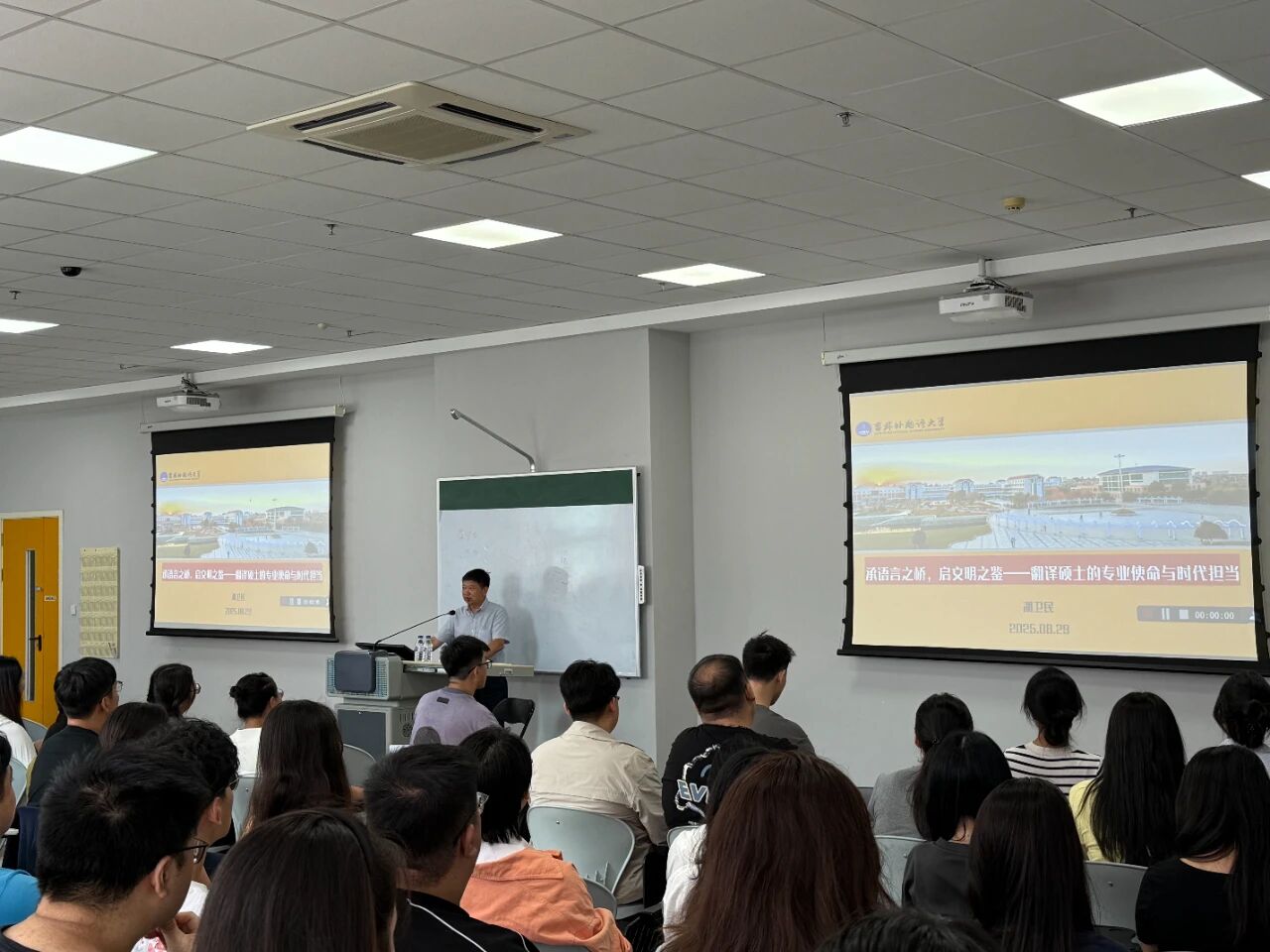 2025年8月29日下午,高级翻译学院2025级新生入学教育大会在新地球村214多媒体教室顺利举行。学院院长潘卫民教授、研工办主任张泮坤老师、辅导员赵祎冉老师莅临现场,全体2025级新生共同参会。本次入学教育犹如新学期的“第一课”,为新生们指引前行方向,也为他们未来的学习与生活奠定了坚实基础。