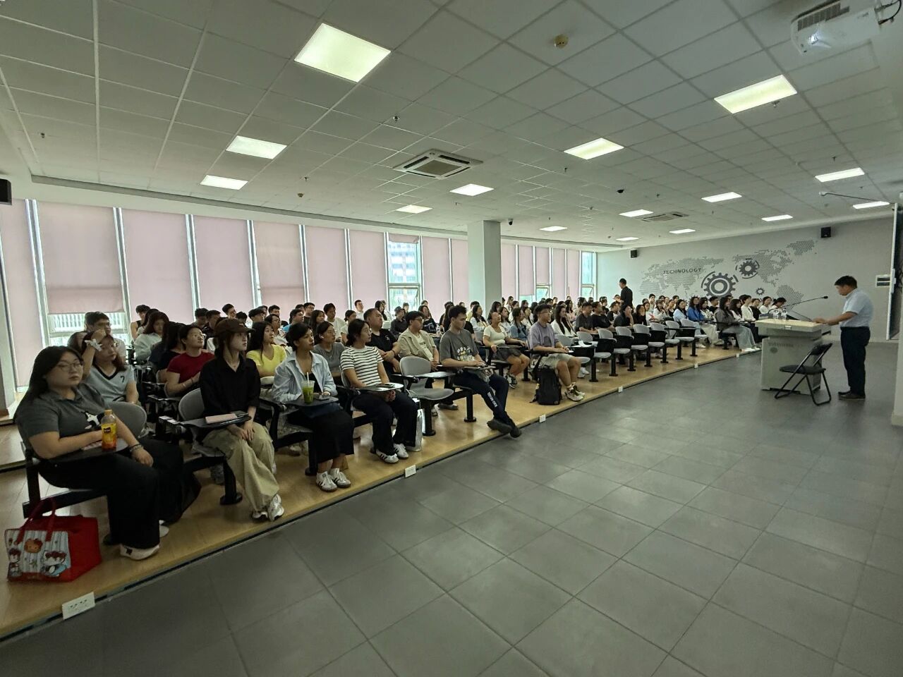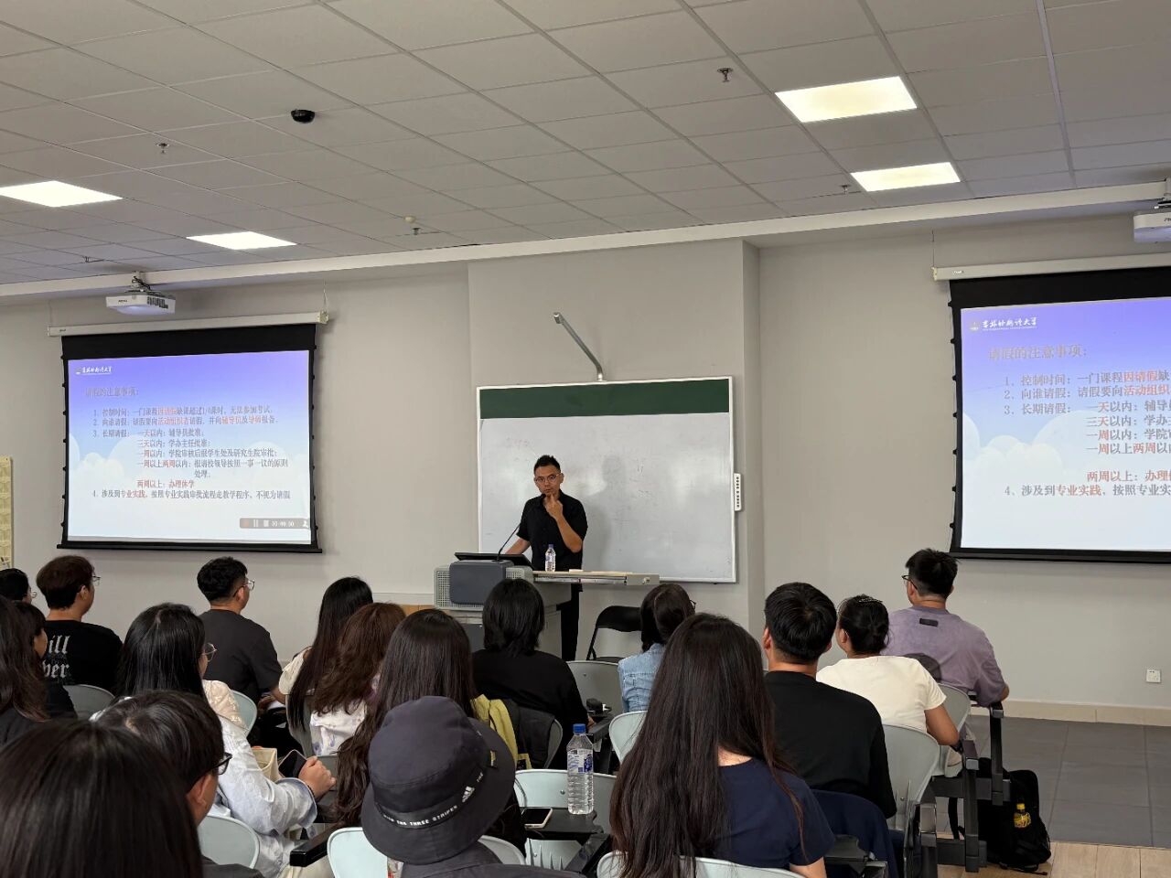 随后,研工办主任张泮坤老师围绕学生日常管理作出细致讲解。他强调了学籍管理、学习纪律、安全规范等方面的基本要求,并提醒同学们在保持自律的同时也要善于调节生活节奏,做到学习与生活并重。张老师的讲话既具体实在,又饱含关切之情,为新生们即将开始的校园生活提供了清晰的指引。