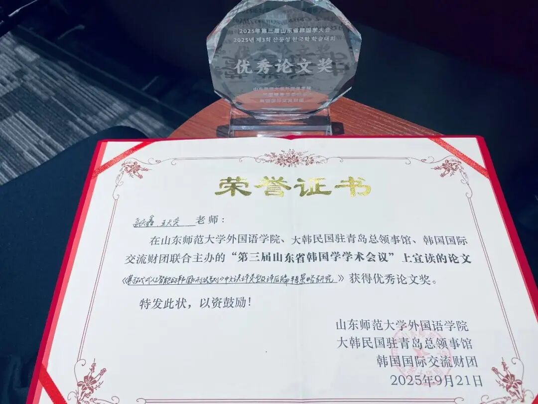 近日,由山东师范大学外国语学院、韩国驻青岛总领事馆、韩国国际交流财团联合主办的“第三届山东省韩国学学术大会”在济南圆满落幕。我校高级翻译学院2024级朝鲜语笔译专业研究生王天奕与导师孟庆鑫老师共同受邀参会并宣读合作完成的论文《基于生成式人工智能的韩国<刑法总则>中文误译类型及译后编辑策略研究》,凭借扎实的研究质量与突出的实践价值,最终从50余篇参会论文中脱颖而出,荣获“优秀论文奖”,为学校赢得荣誉!