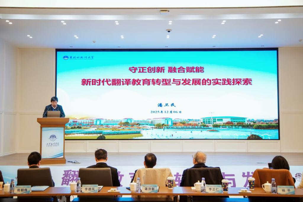 我院潘卫民院长参加此次会议并交流发言。潘卫民院长围绕“翻译教育的转型与发展”主题,娓娓阐述翻译教育正面临国家战略需求升级与技术革命的双重驱动,从“聚焦国家战略,重塑人才培养目标”、“聚焦技术融合,革新教育教学模式”、“聚焦产教融合,强化实践能力培养”及“聚焦学科交叉,拓展人才培养内涵”四个方面讲述如何构建适配新时代需求的翻译人才培养体系,并指出翻译教育的转型不是单点突破,而是系统性变革 —— 既需要坚守 “立德树人” 的根本,培养兼具家国情怀与专业能力的人才;也需要敢于创新,以技术为笔、以协同为墨,描绘翻译教育的新图景。