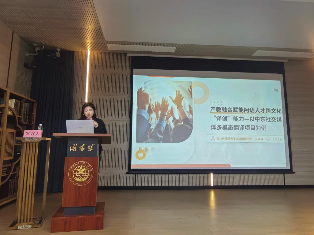 在“人工智能+”阿拉伯语人才培养主题研讨环节,马潇潇老师以 “产教融合赋能阿语人才跨文化‘译创’能力——以中东社交媒体多模态翻译项目为例” 为题进行论文宣读与分享。她在发言中指出,在全球化与数字化深度融合的今天,传统的语言服务正向涵盖翻译、本地化、跨文化创意改编的“译创”模式转型。人工智能技术的崛起既带来挑战,也为阿语人才培养提供了新的工具与场景。